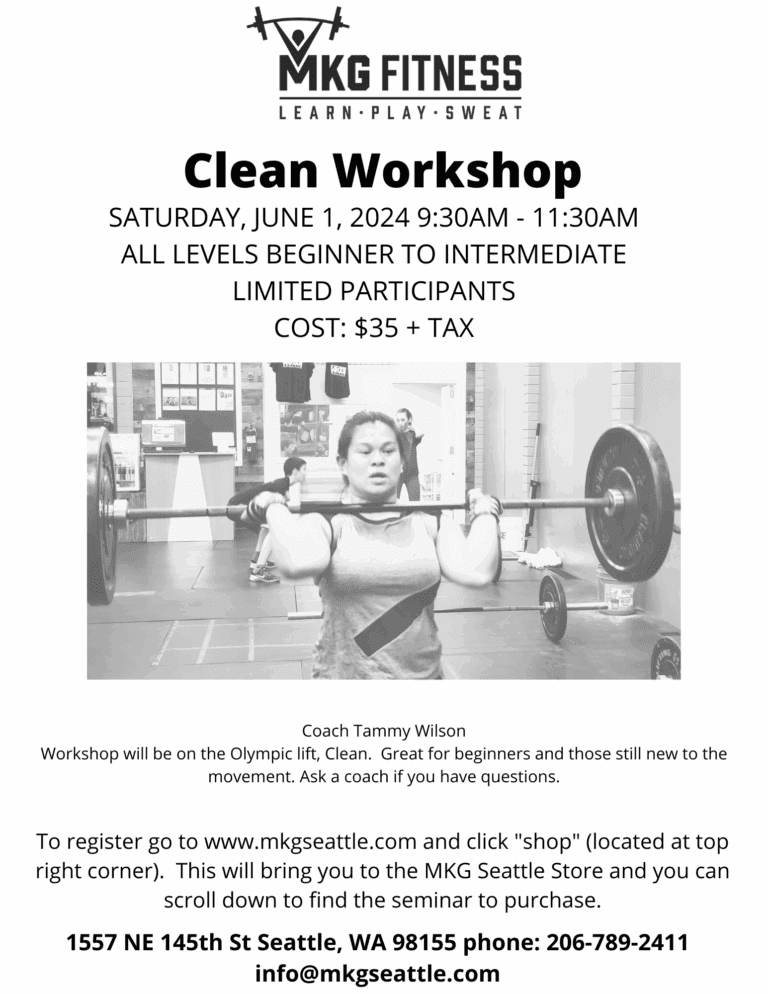 With Coach Tammy WilsonJoin Coach Wilson at MKG Fitness on Saturday, June 1st at 9:30 am for an Olympic Lift (Clean) Workshop. All levels are